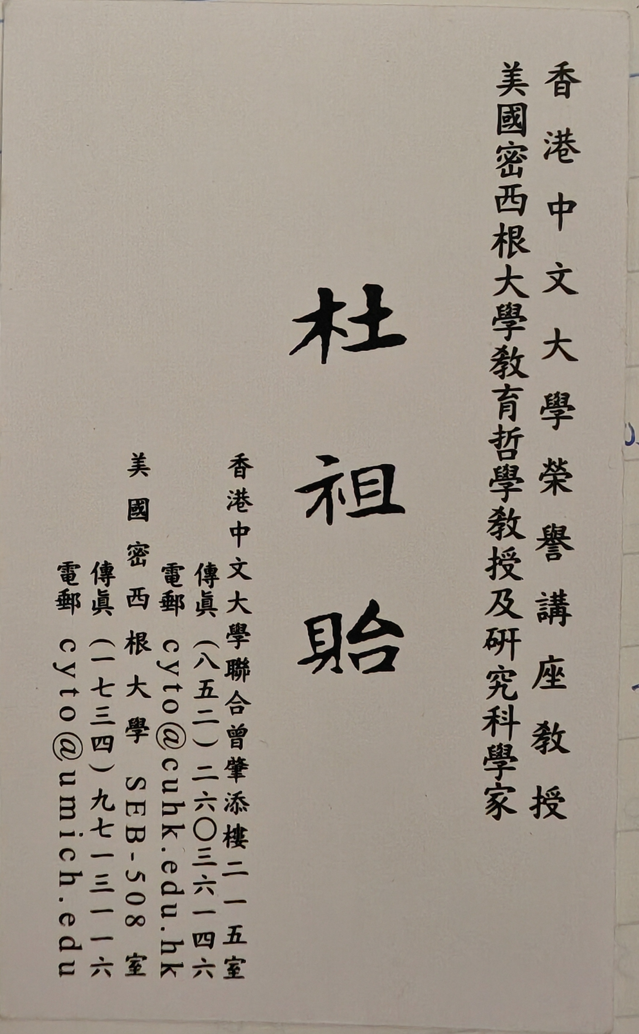 杜教授十方大方分享這方面的故事: 祖父為旅港福建商會之創辦人杜四端,母親歐陽傑芳為一名教師,有2弟1妹(其中一弟杜祖貺曾是俄亥俄州立大學電腦研究中心數學組副研究員)。