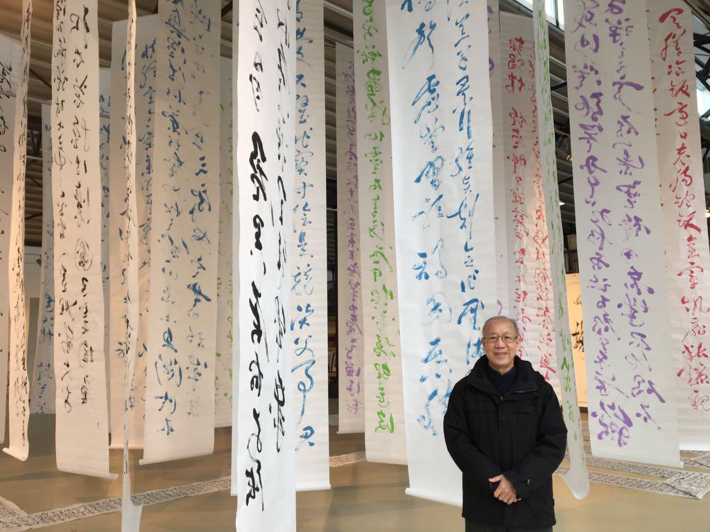 2018年在美國華盛頓特區喬治華盛頓大學作書法示範時攝 2018年攝於Amsterdam 視覺藝術中心自己的書法裝置藝術前