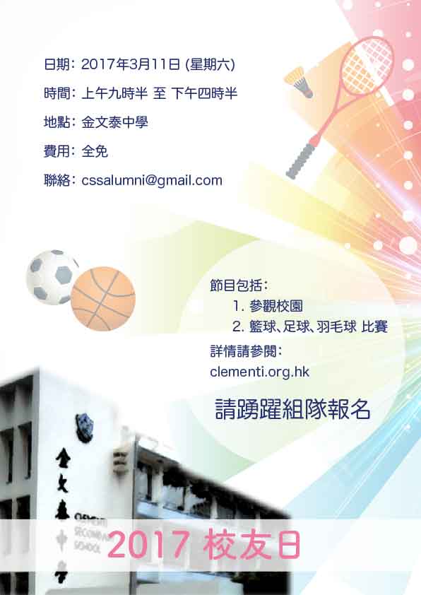 本會與母校謹訂於本年三月十一日(星期六)舉辦校友日,讓各屆校友樂聚一堂。當天所有活動及比賽,皆歡迎校友攜同親友一起組隊或以個人名義參加。是次活動節目豐富,不容錯過!
