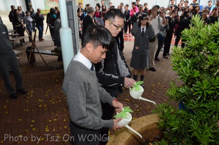 追思會完結後,一眾參加者移步至排球場旁觀看植樹儀式。隨著由羽毛球製成的幕緩緩展開,植樹儀式便告禮成。而一眾觀禮者,也拿起預先準備的水壺為象徵師叔的羅漢松澆水。願師叔精神長存母校,保守著一代一代的「金記人」。