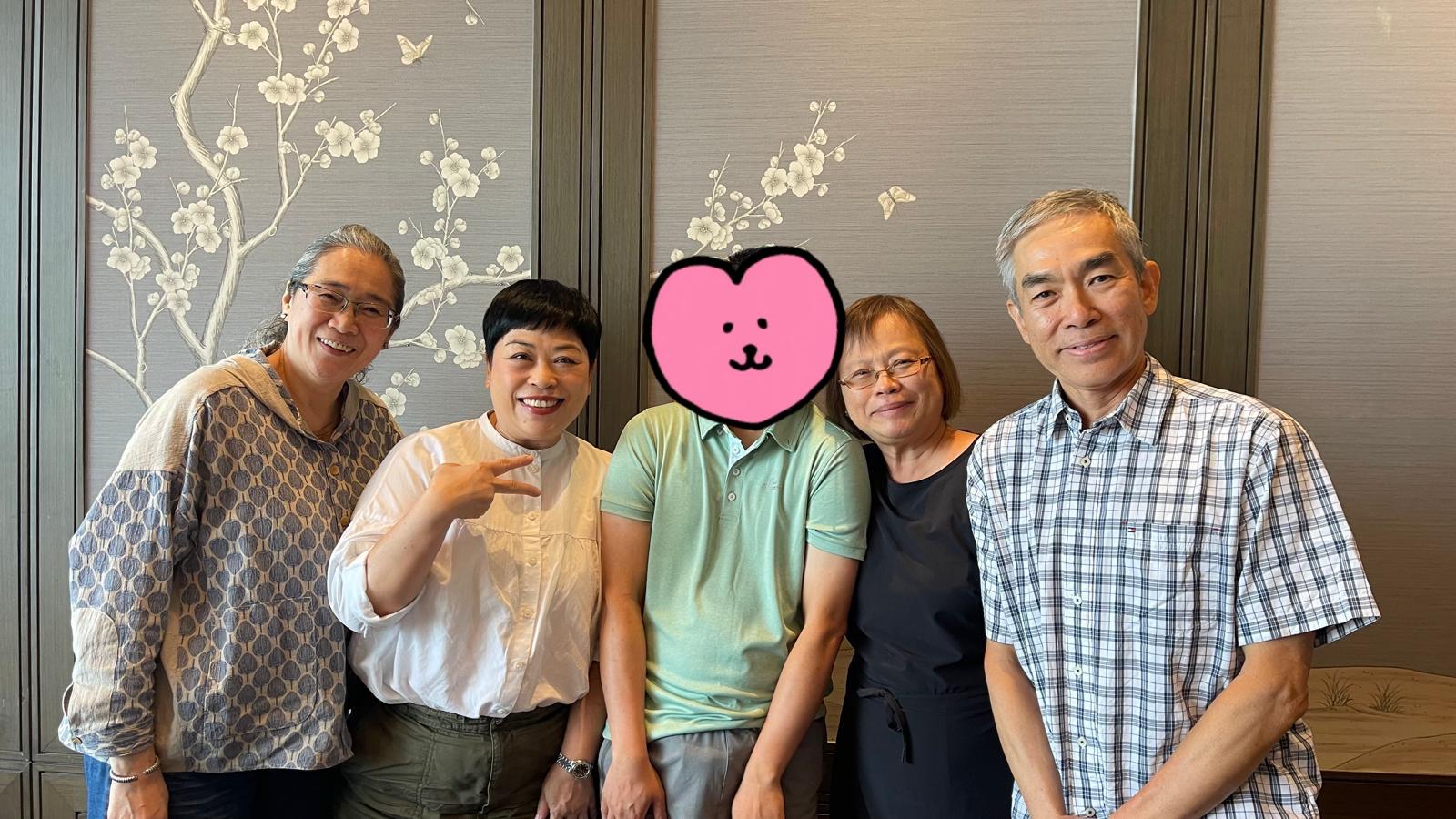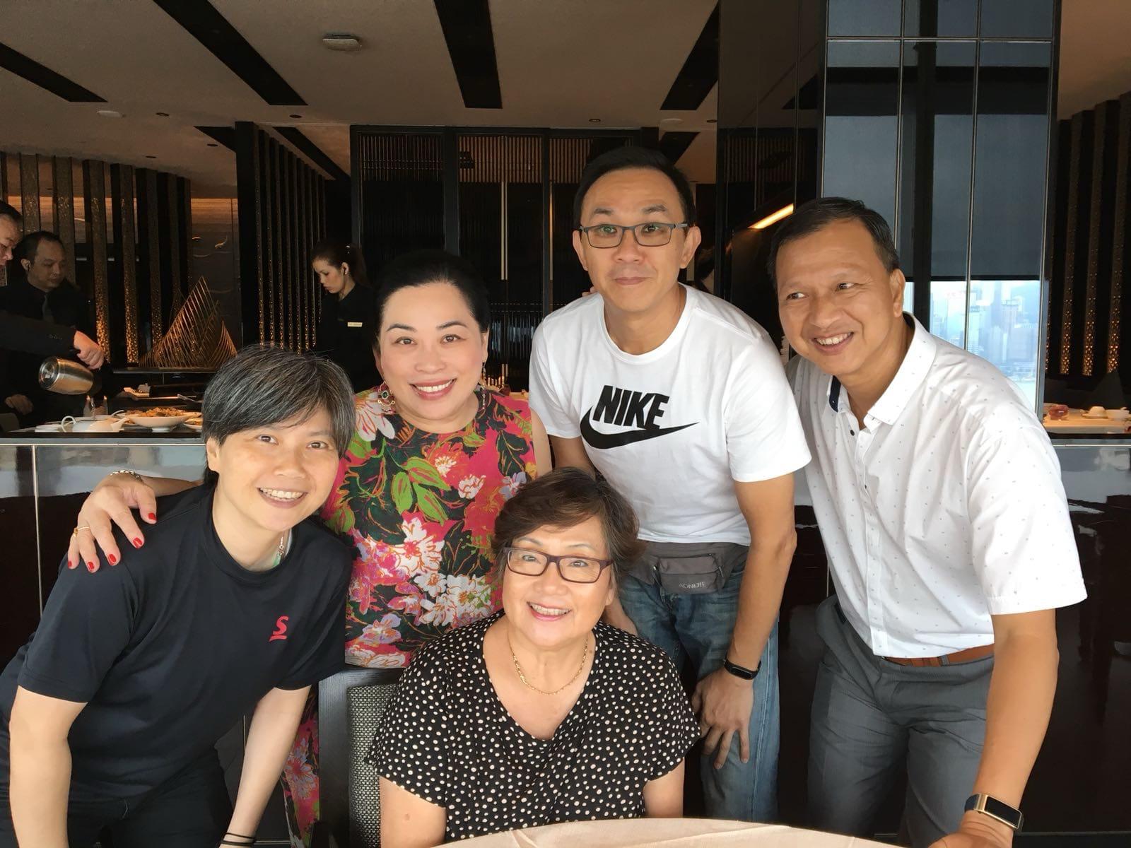 同屆同學相約丁月麗老師(中)茶敘, 可惜羅美倫(左一)和成志強(右一) 分別於2022和2020乘鶴西歸, 剩下Michelle和程大偉(右二)令她嘆唏噓! 攝於2018 |